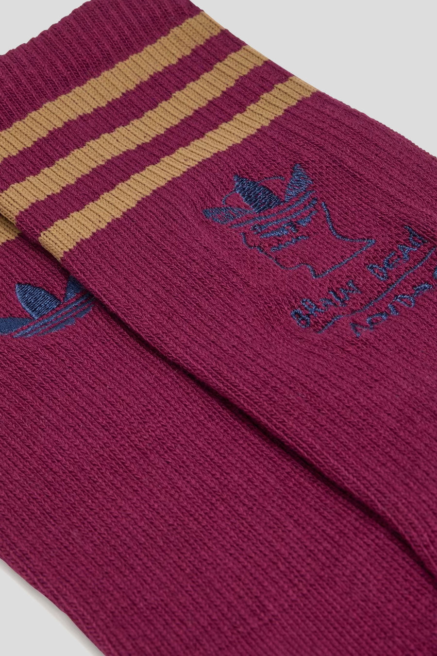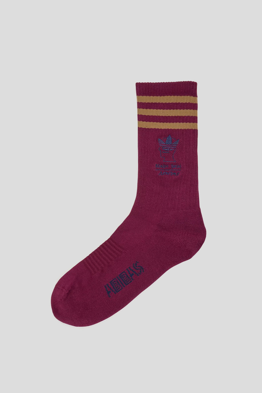 The pair of socks from the collaboration between ADIDAS and BRAIN DEAD is a unisex product made from recycled cotton and polyester. This burgundy-red pair of socks features a combination of the two brands' logos and the iconic ADIDAS 3 stripes.