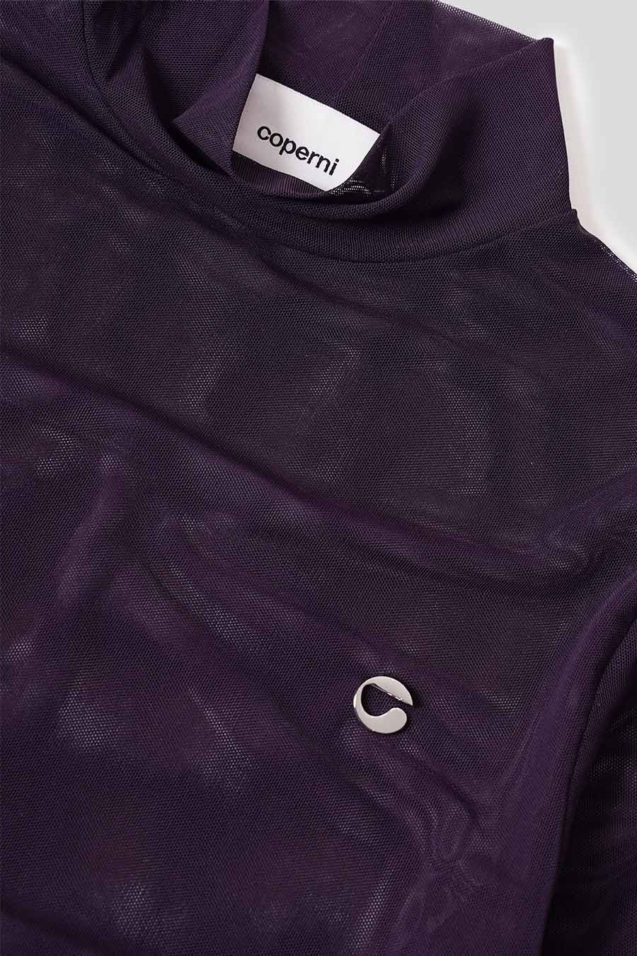 This t-shirt from Coperni is a women's product made from polyamide and elastane. This top features short sleeves, a transparent stretch knit in a dark burgundy tone, you'll find the brand's silver "C" logo on the left chest.