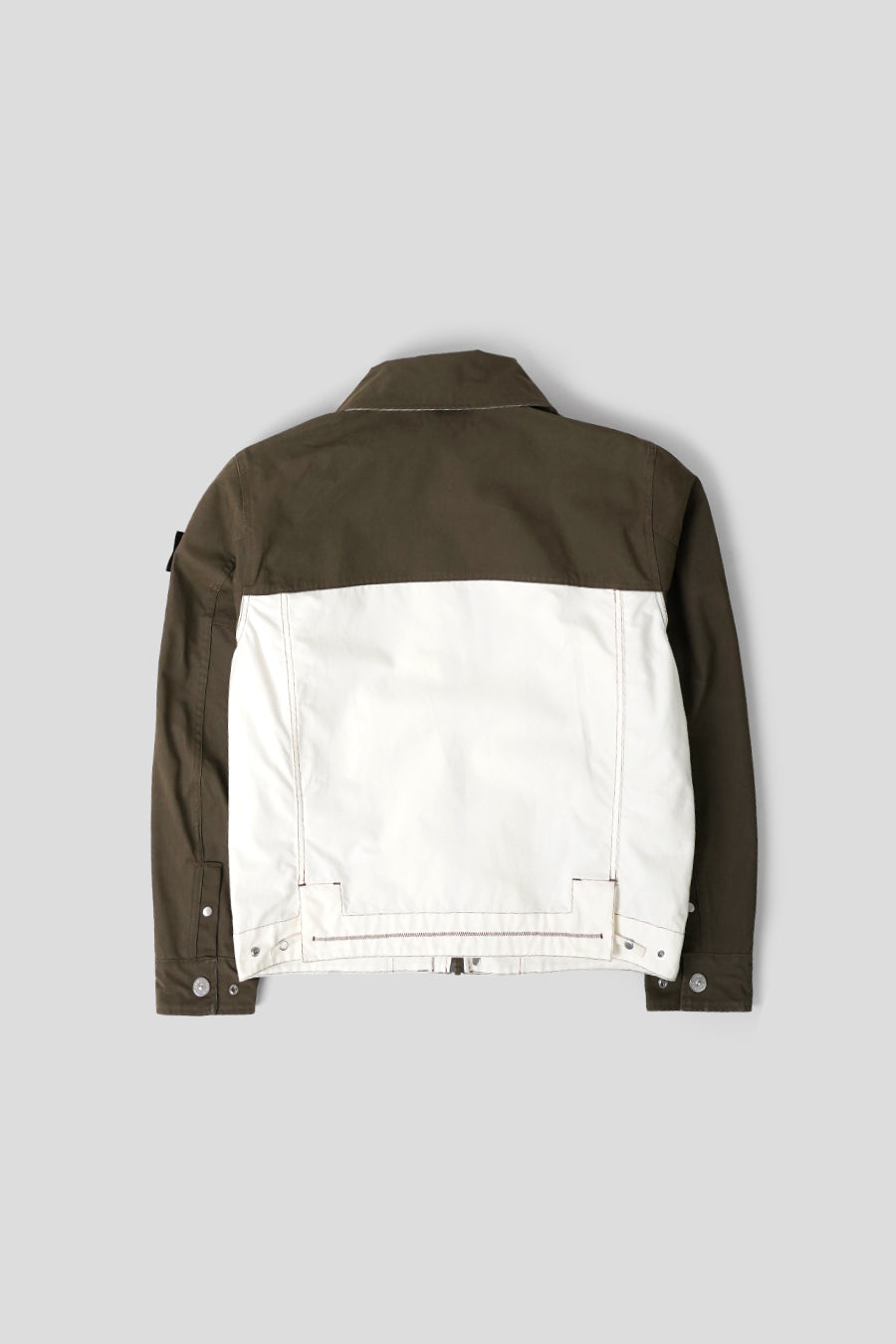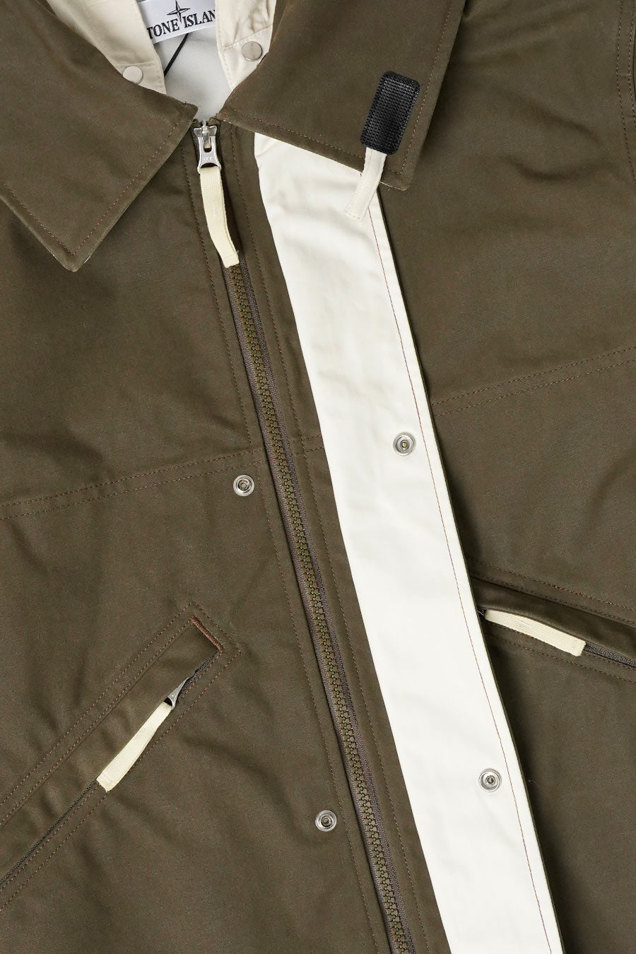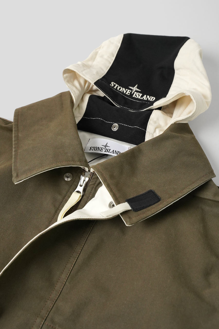 The fabric is inspired by the resin-treated “Tela” of early Stone Island collections. The cotton fabric is colored on one side and impregnated with pigmented resins in contrasting colors on the other. You'll find double-sided materials: both sides can be used on the outside of the garment. External parts not treated with resin receive a water-repellent treatment.