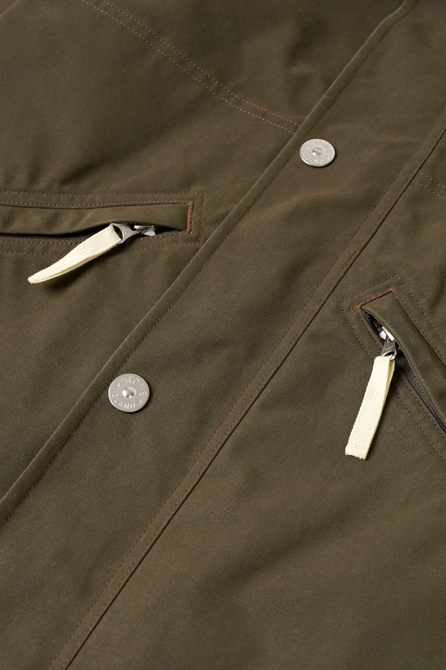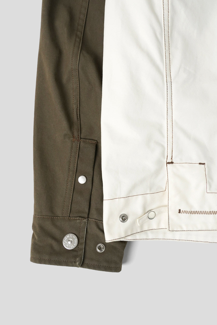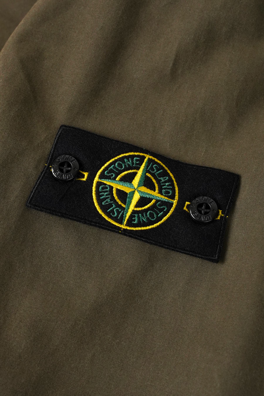The fabric is inspired by the resin-treated “Tela” of early Stone Island collections. The cotton fabric is colored on one side and impregnated with pigmented resins in contrasting colors on the other. You'll find double-sided materials: both sides can be used on the outside of the garment. External parts not treated with resin receive a water-repellent treatment.