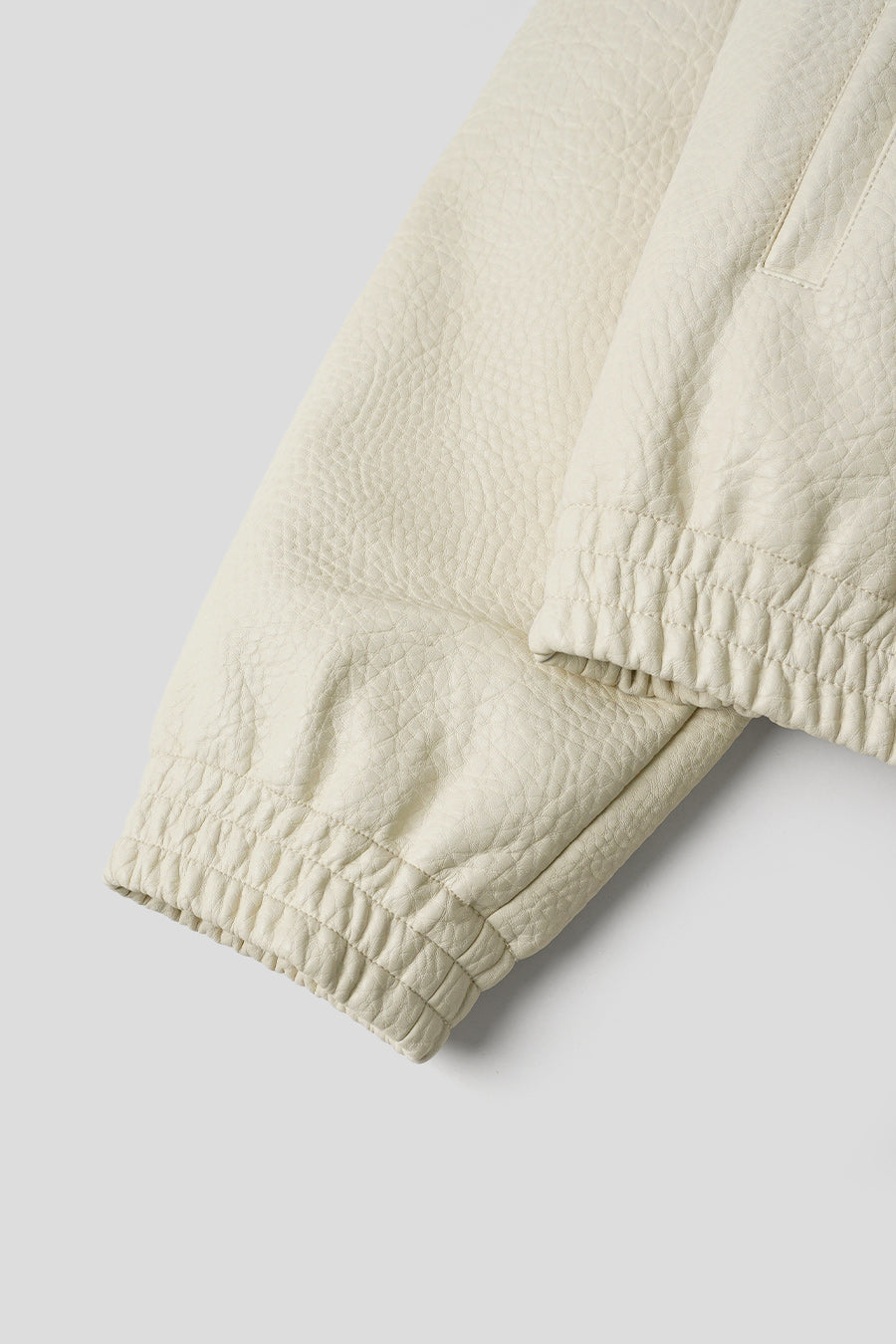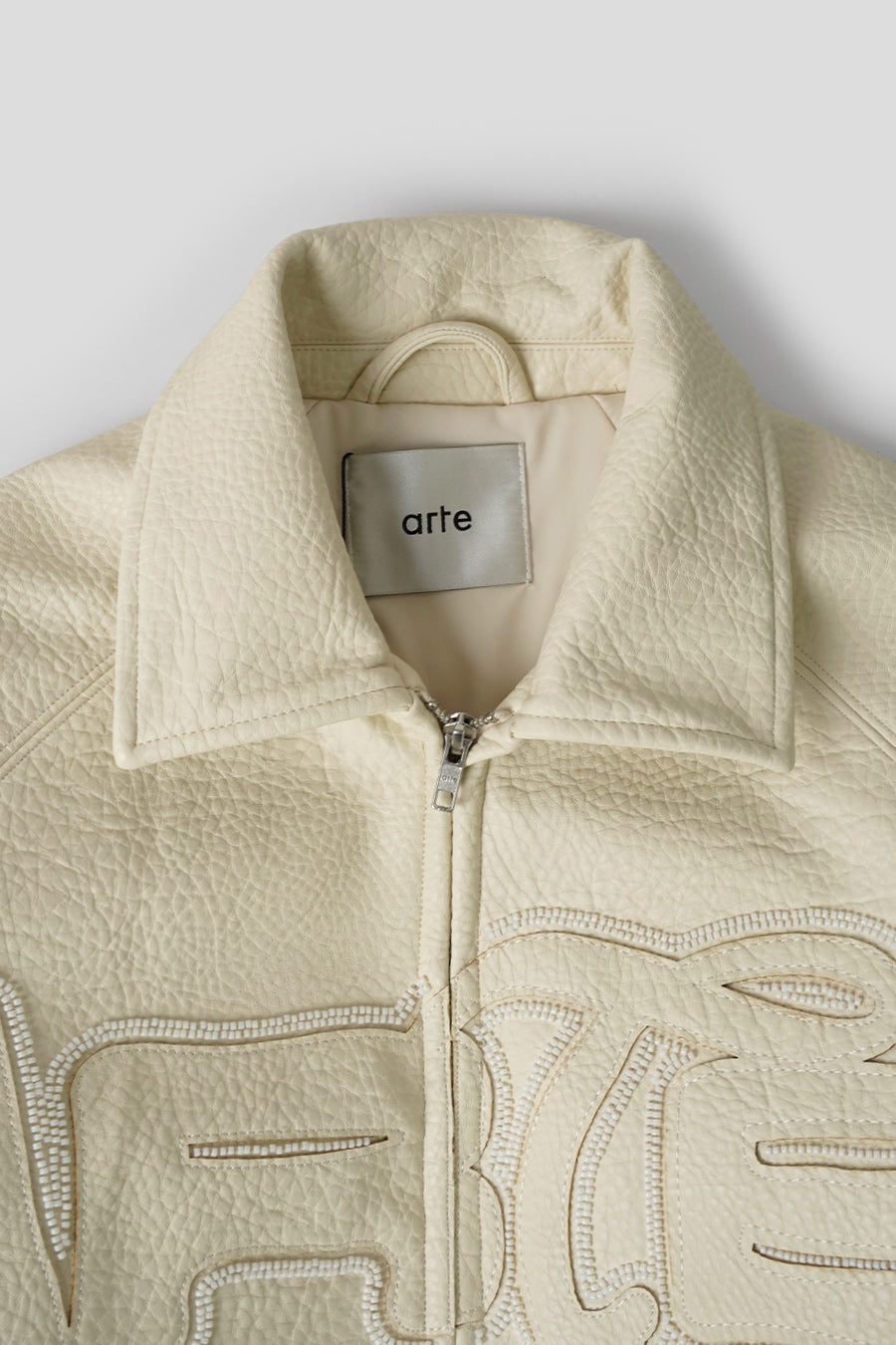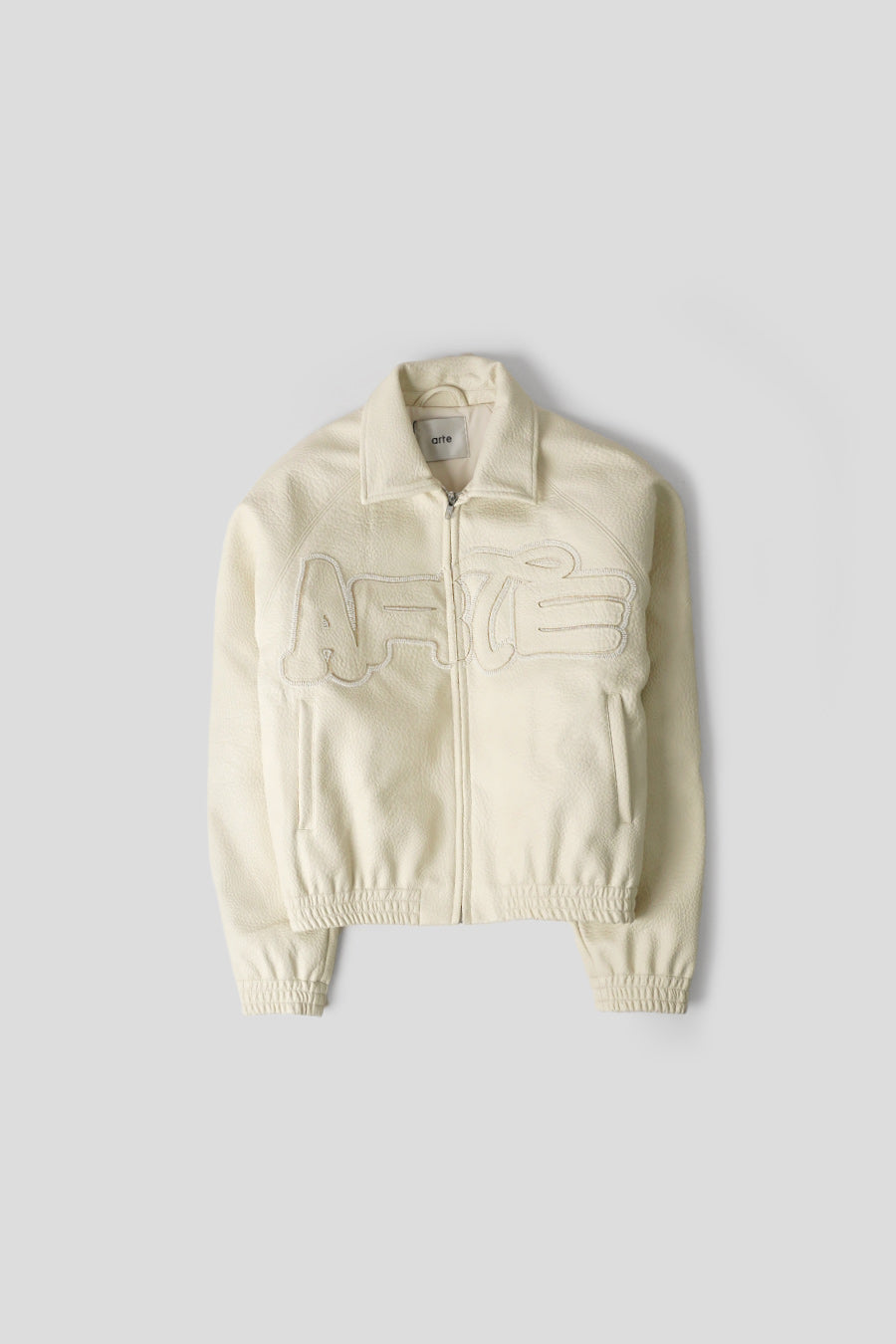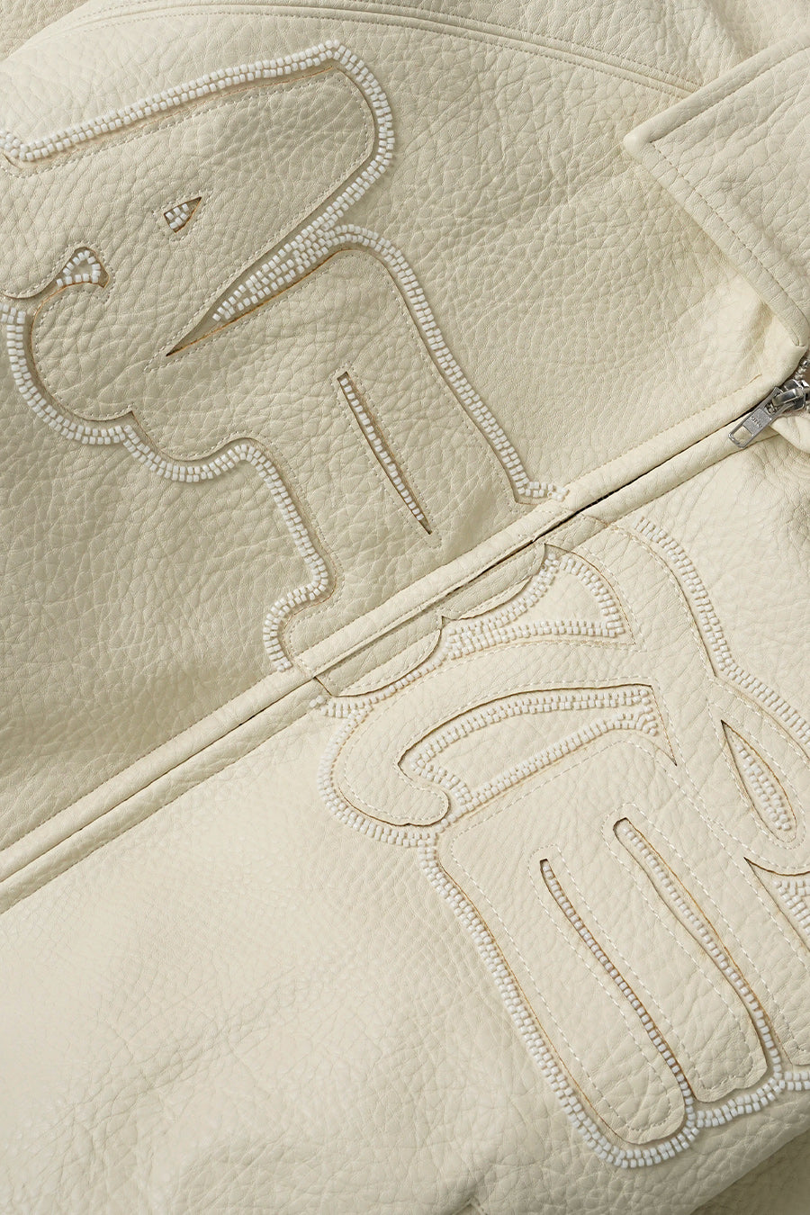 La veste BIG LOGO LEATHER de chez ARTE est un produit pour hommes fabriqué en faux cuir composé de polyuréthane et de polyamide. Cette veste à la couleur crème à la coupe décontractée arbore un grand écusson orné de perles blanches sur la poitrine. Elle dispose d'une fermeture à glissière, de deux poches latérales ainsi qu'une taille et des poignets élastiqués.