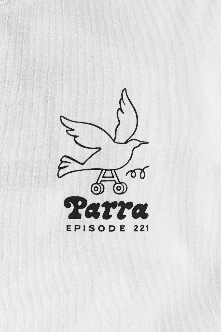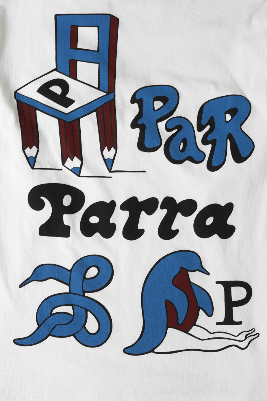 La coupe est boxy. Il arbore un imprimé By Parra avec un oiseau à roulettes au niveau de la poitrine, une chaise. D'autres illustrations By Parra sont présentes au dos du T-shirt en couleur.