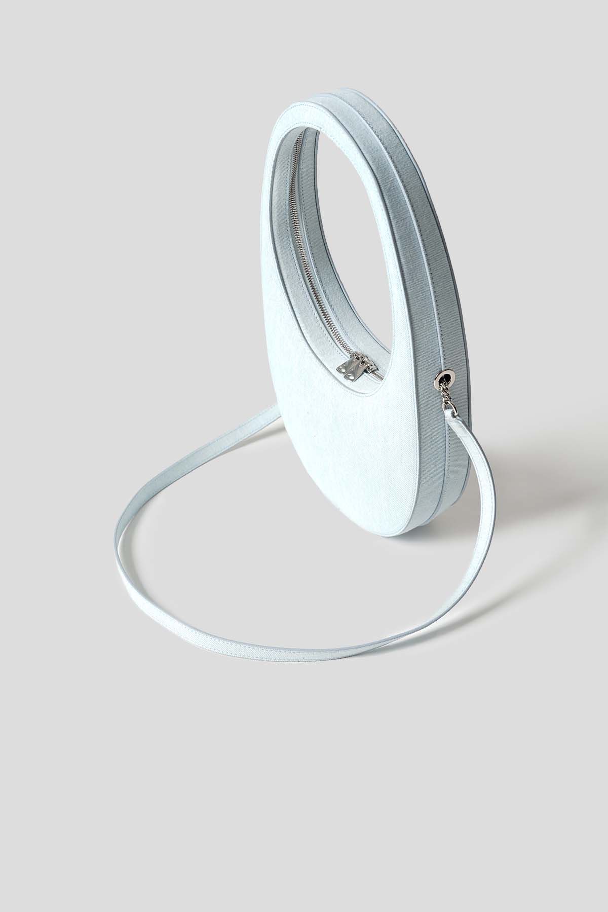 Le sac Crossbody Swipe Bag de chez Coperni a été confectionné en denim bleu clair. Ce sac présente une forme ovale et est doté d'une fermeture éclair blindée à double extrémité. En effet ce n'est autre que le célèbre Swipe Bag auquel a été rajoutée une sangle détachable pour que vous puissiez le porter en bandoulière ou sur votre épaule.