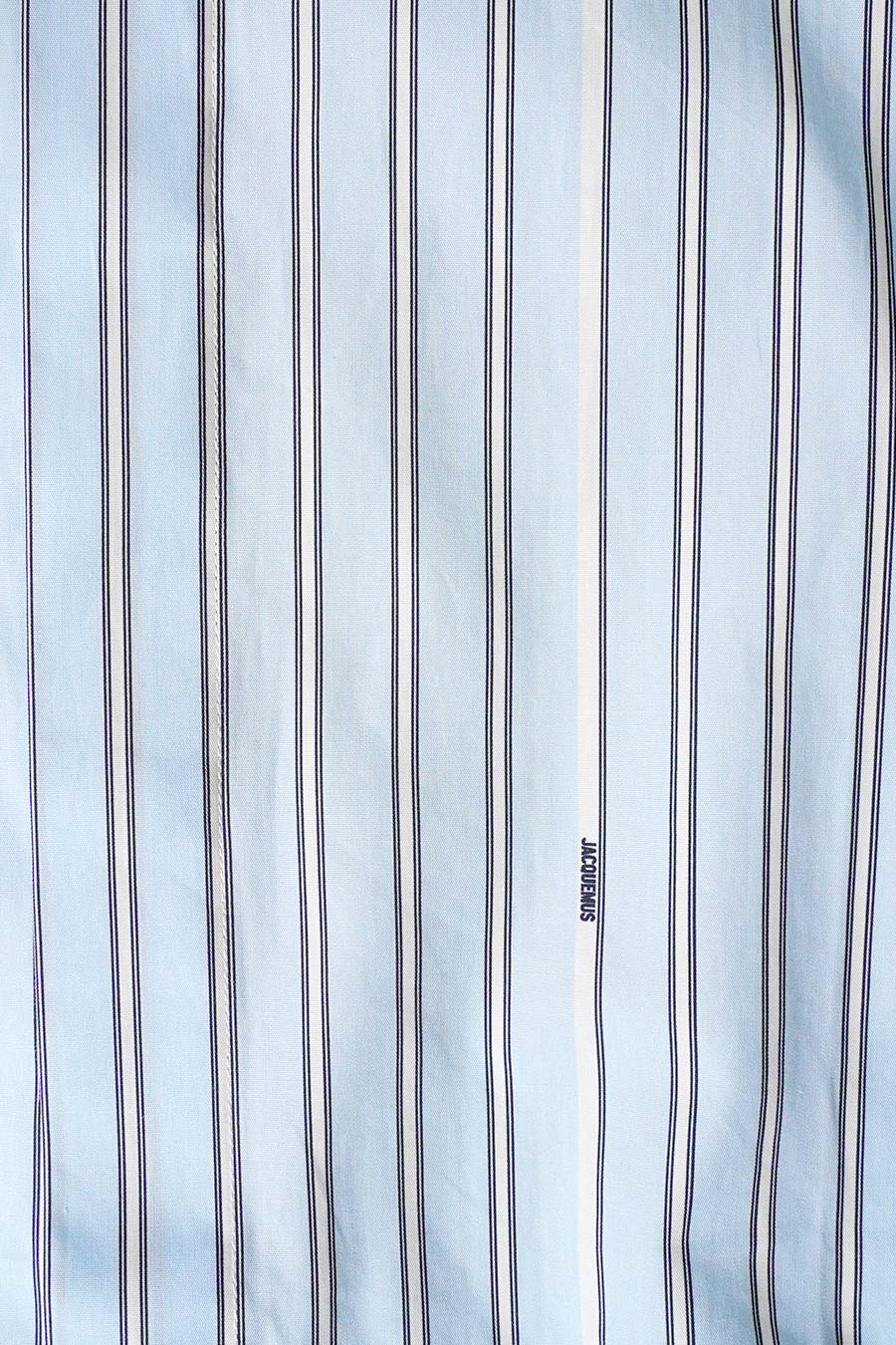 Cette chemise présente une coupe droite oversize, un col classique, des boutons à pression et l'inscription "JACQUEMUS" dans les rayures de la chemise.