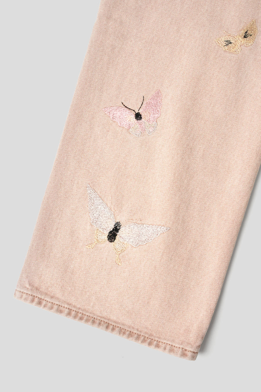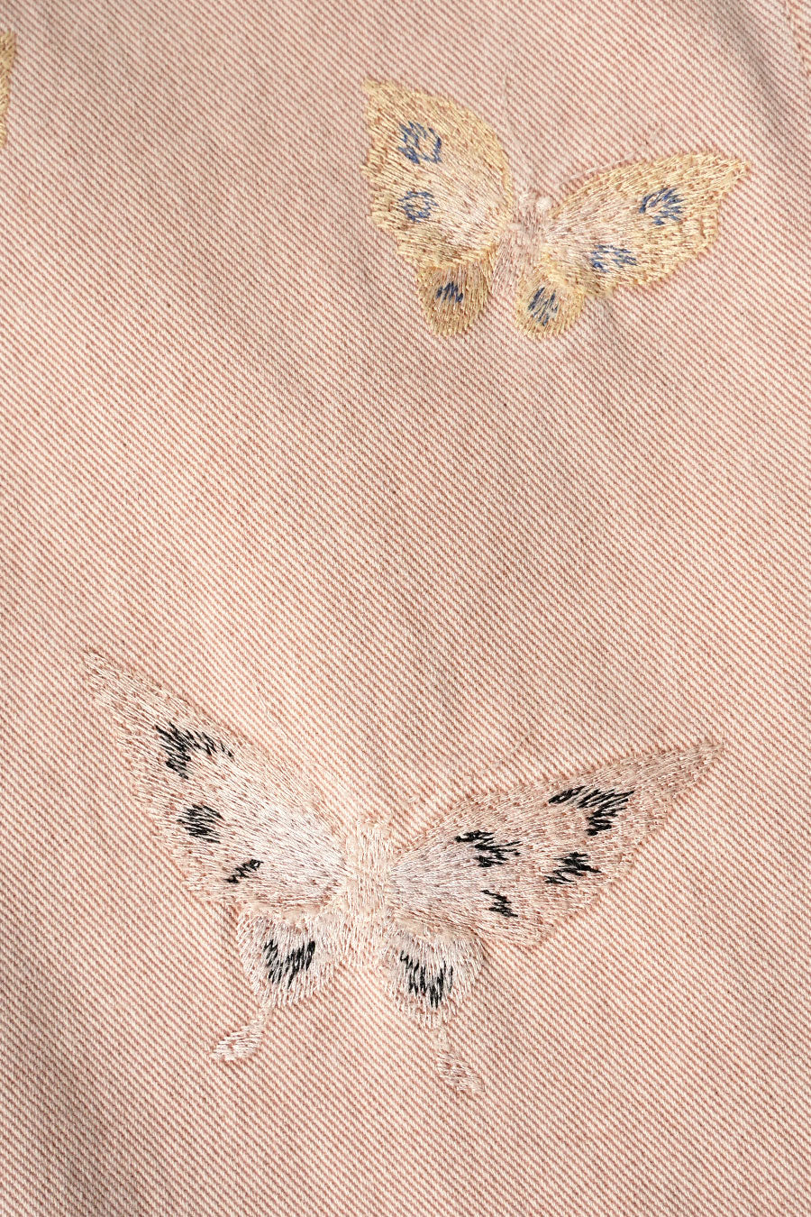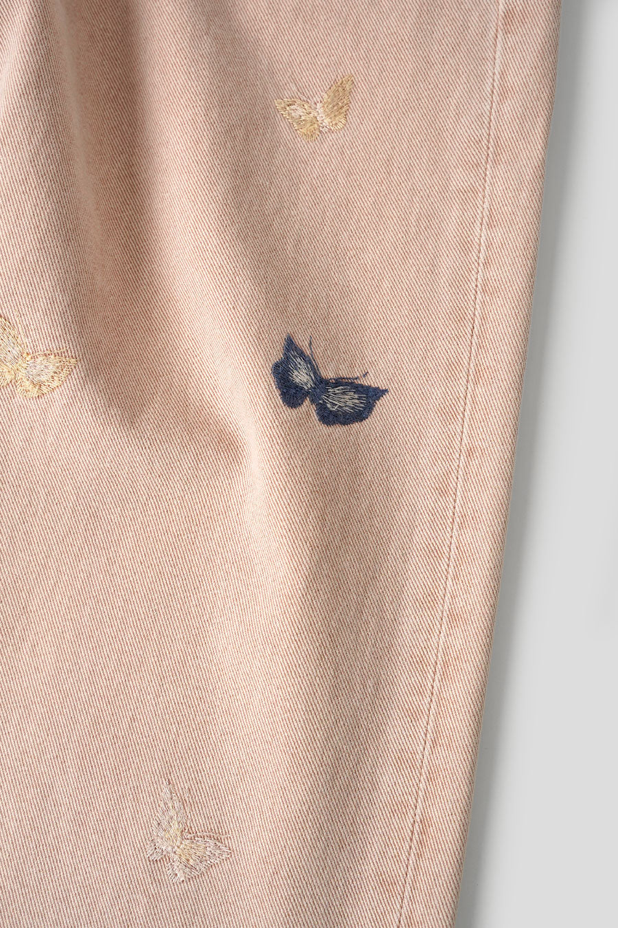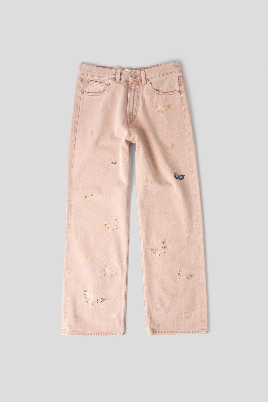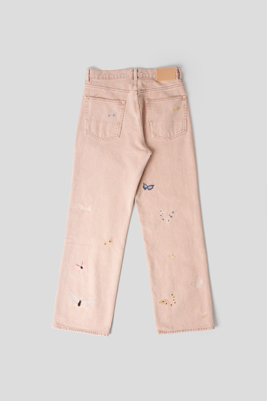 Il présente une coupe décontractée et ample avec une braguette zippée YKK, des rivets métalliques et des poches arrières renforcés. Chaque pièce est unique et a fait l'objet d'un lavage spécial pour obtenir un effet vintage. Ce qui le distingue, ce sont les broderies papillon ton sur ton qui flotte sur les jambes, il sera façonné par son porteur et s'abîmera naturellement au fil du temps pour achever le processus de conception.