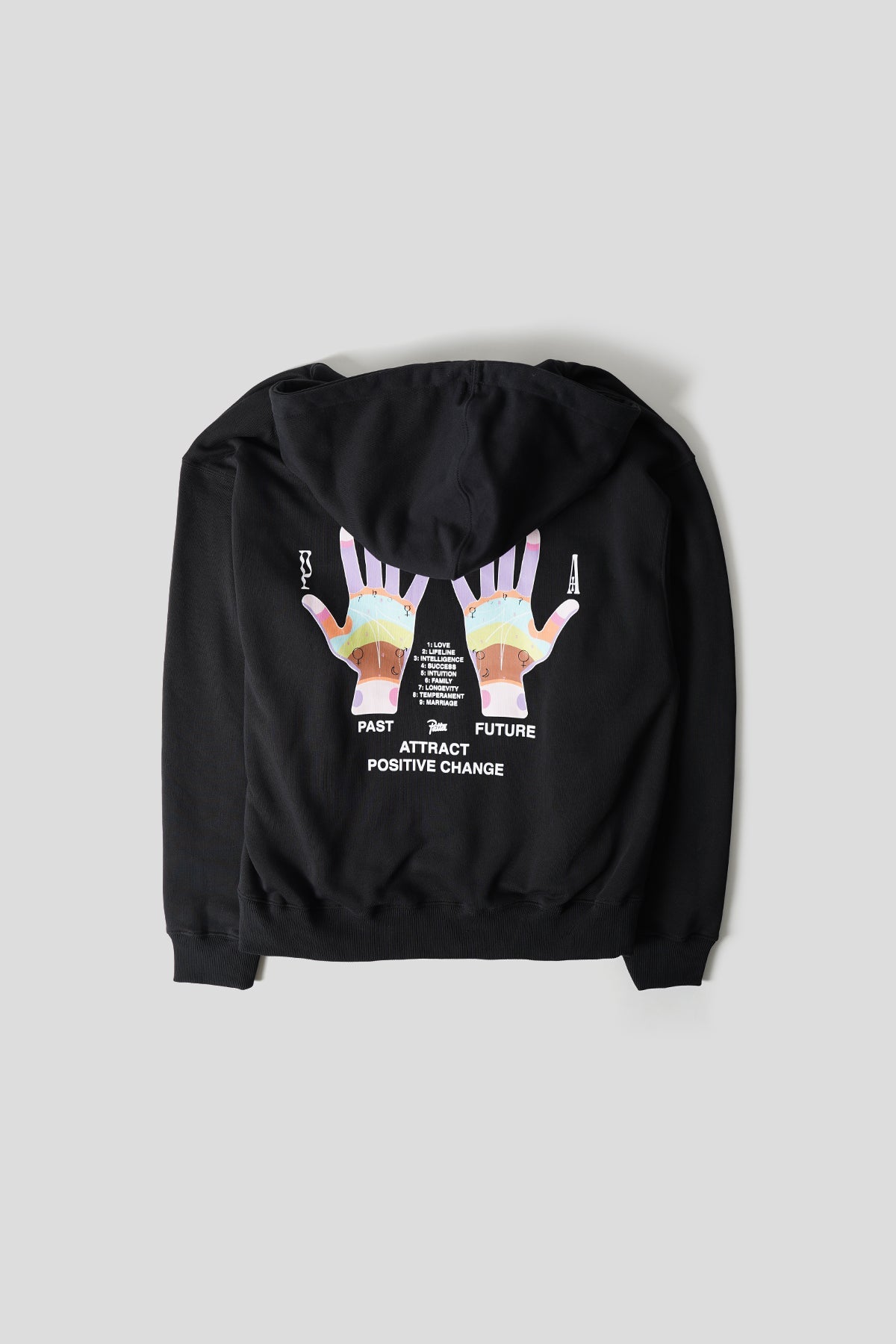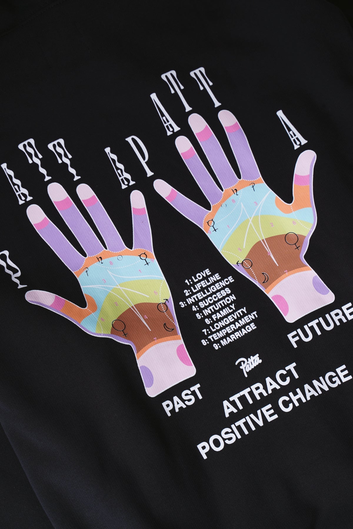 Le pull à capuche Patta Palmistry Boxy en noir est fabriqué en 450 grammes, 100 % coton BCI. Il est brossé et doux au toucher. Il est doté d'une poche kangourou, d'un ourlet inférieur côtelé avec des poignets et d'une capuche à cordon de serrage. Sur le devant de la pièce, le logo Patta est sérigraphié sur le côté gauche de la poitrine. L'arrière de la pièce est décoré d'un dessin sérigraphié reprèsentant la lecture des lignes de la main